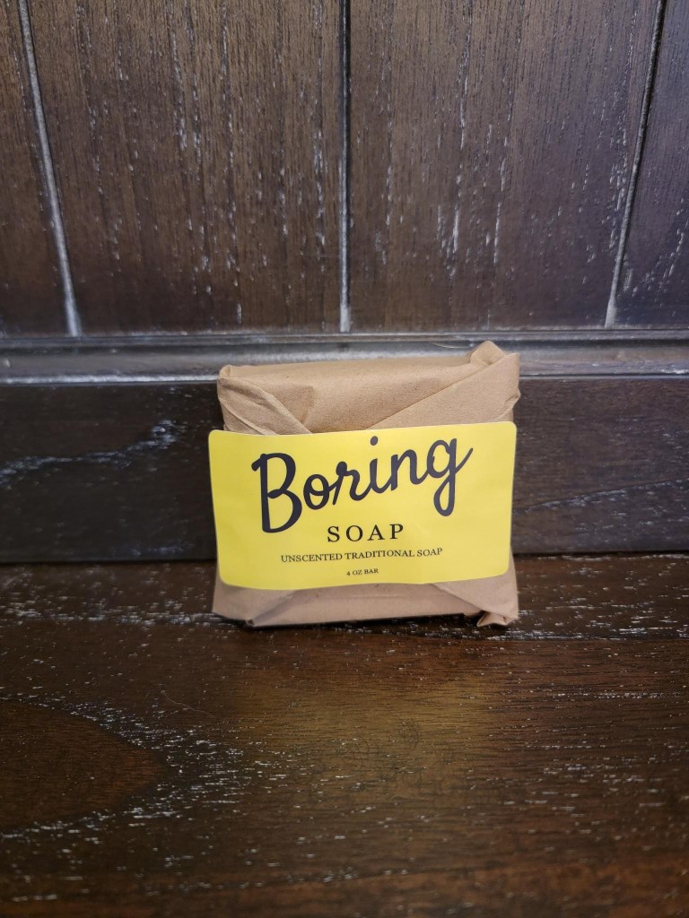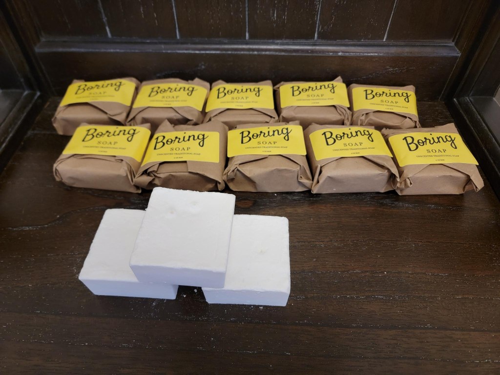 THE BORING SOAP COMPANY MAKES TRADITIONAL, UNSCENTED SOAP WITH SIMPLE INGREDIENTS: WATER, LYE, COCONUT OIL, PALM OIL & OLIVE OIL